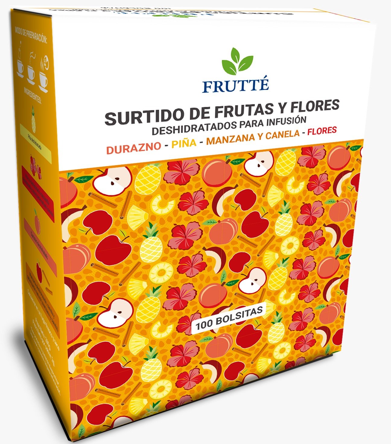 Ingredientes: Hecho de piña, manzana y canela, tutti frutti y flores